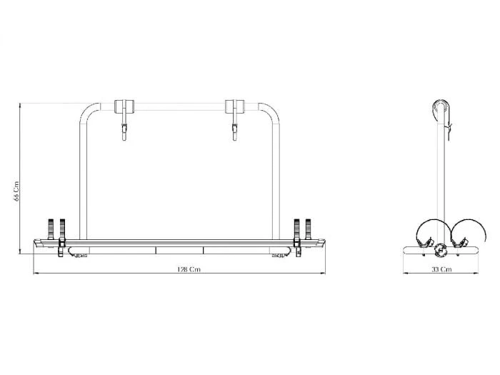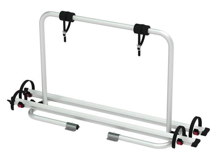 Le support de ce porte-vélos peut être rabattu vers l’avant pour atteindre le timon. Le porte-vélos Fiamma Eco est livré en standard avec 2 rails, 2 sangles de fixation et du matériel de montage.