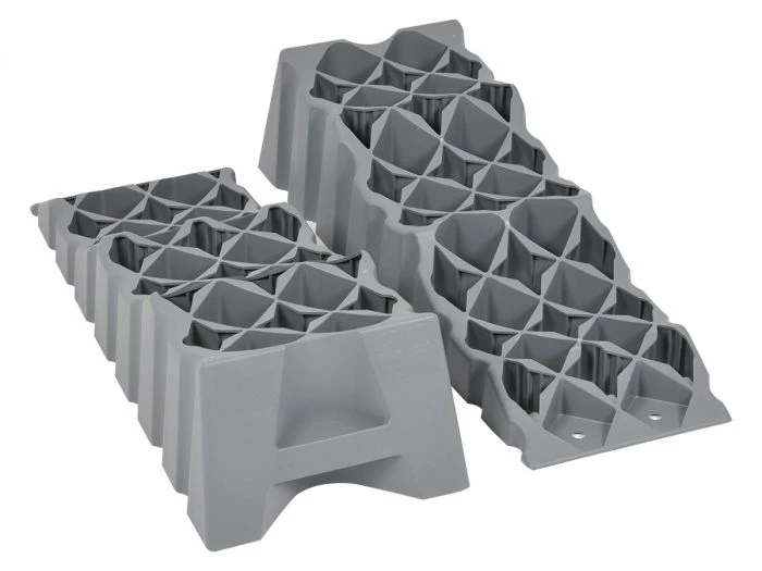 La cale roue est pourvue d’une grande surface de soutien, permettant de protéger les pneus contre une quelconque déformation. La structure est à nouveau conçue pour satisfaire aux exigences des capacités de charge et de permettre que cela puisse s’adapter à un sol inégal.