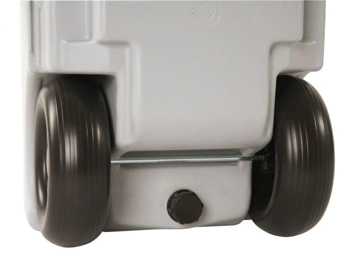 Réservoir avec des roues de Fiamma. Pour de l’eau résiduaire. Equipé avec une poignée et une valve pratique, pour vider le réservoir.