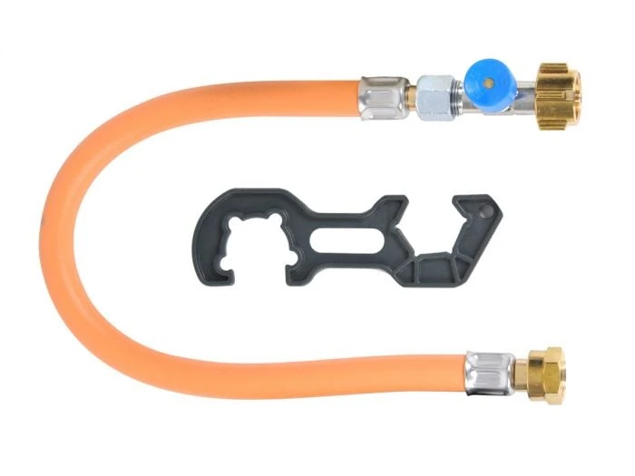 Le kit de détendeur de gaz Obelink Drive One est fourni avec un tuyau de gaz ConnectDrive G12. Ce tuyau de gaz haute pression est équipé d’une valve de rupture de tuyau, qui empêche le gaz de s’échapper de la bouteille lorsque le tuyau est déchiré. Le tuyau de gaz a un raccord d’entrée G12 et un raccord de sortie à filetage intérieur M20 x 1,5. La longueur du tuyau de gaz est de 45 cm.