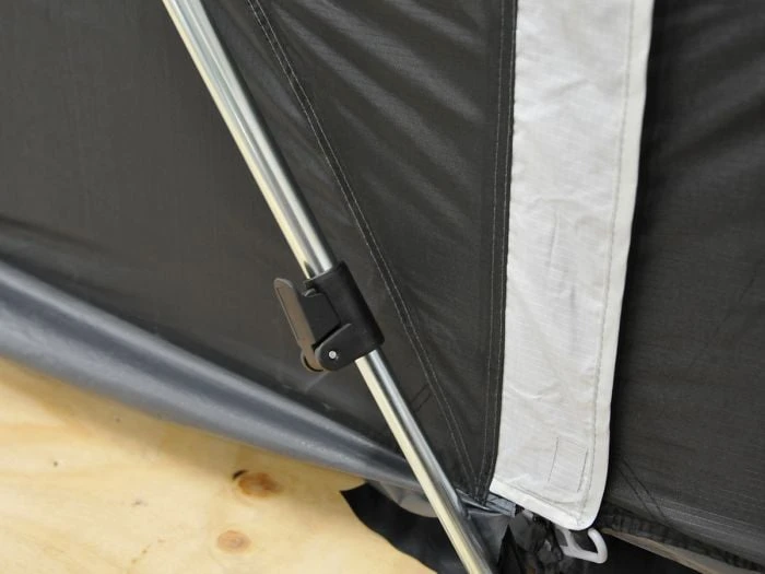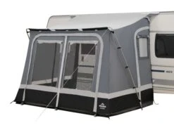 Les cordes, les piquets, le tapis de sol, la jupe, le cache-roue et le sac de rangement sont livrés avec l’auvent. Des coussins en mousse sont cousus sur cet auvent pour une bonne connexion avec la paroi de la caravane. Vous pouvez les fixer avec des sardines afin d’éviter des courants d’air.