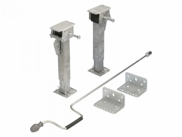 Les vérins ont une capacité de charge maximale de 500 kg. Ils sont réglables en longueur de 290 à 490 mm. Le vérin peut être baissé à l’aide d’une manivelle. Ils conviennent à l’avant et à l’arrière et peuvent même être utilisés sur un sol irrégulier.